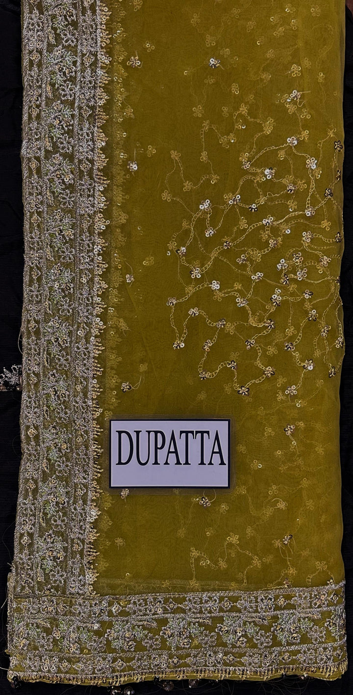 Organza embroidered dupatta 4 sides border with hanging tassels.