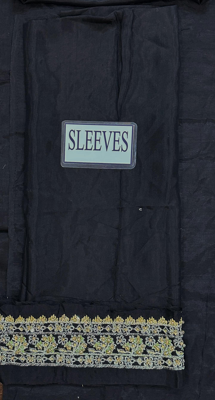 Embroidered raw silk sleeves border.