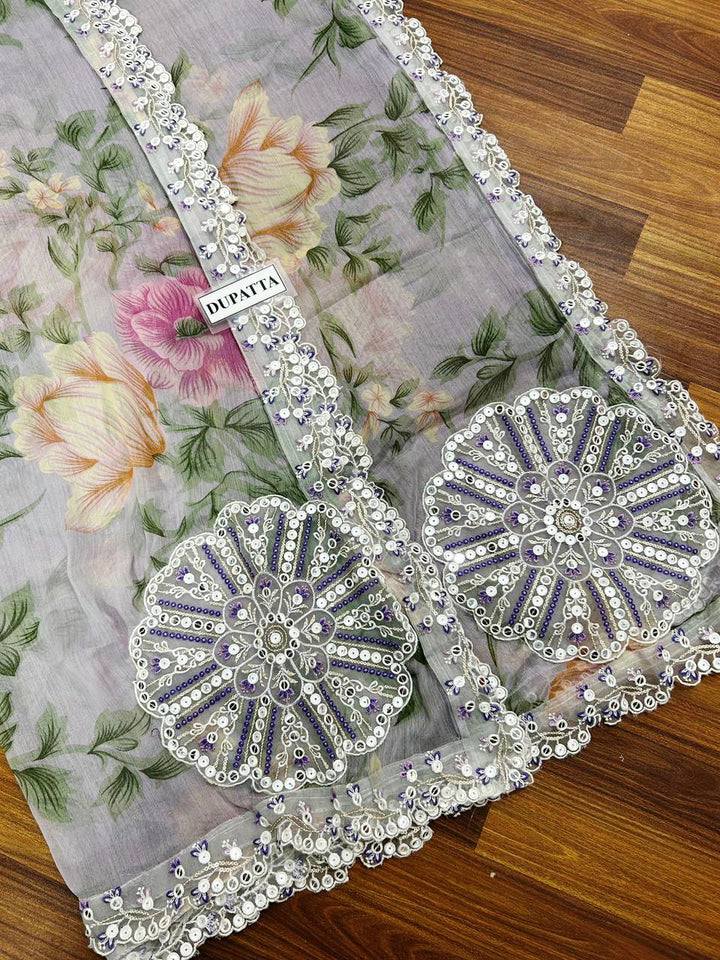 •Printed Chiffon Dupatta with 4 sides embroidered, Ready to wear, with 2 sides Heavy embroidered Bunch 3mm sitara work